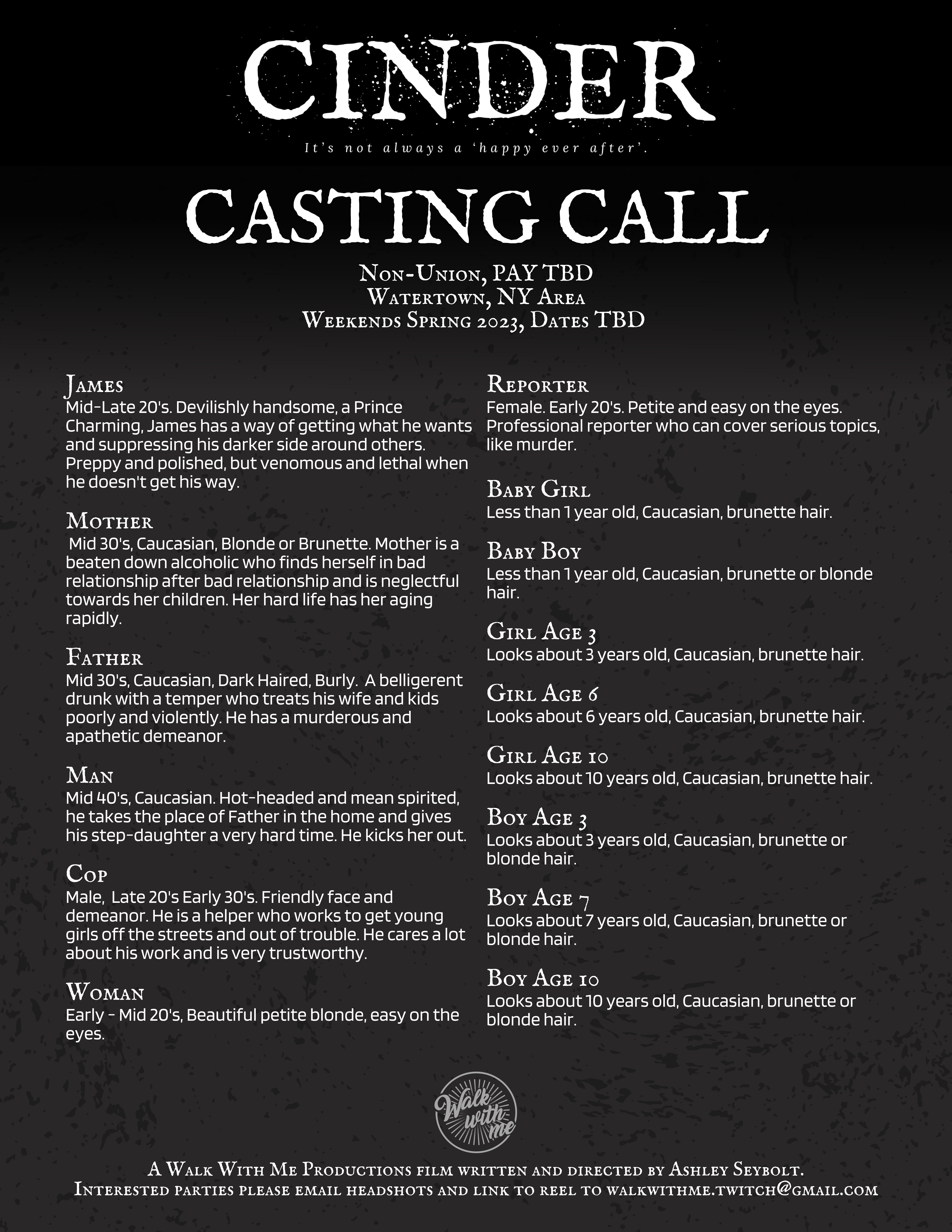 Director / Screenwriter Ashley Seybolt is in search of a cast for her second feature under the Walk With Me Productions umbrella.